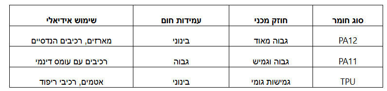 - חוזק מכני שמאפשר שימוש בחלקים כרכיבי קצה פונקציונליים ולא רק כאבות טיפוס.